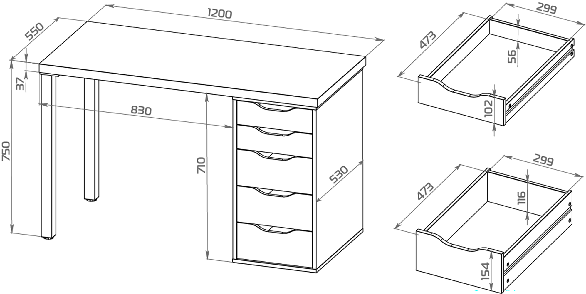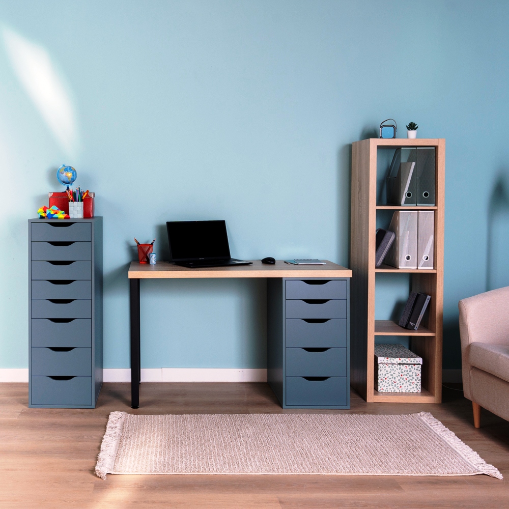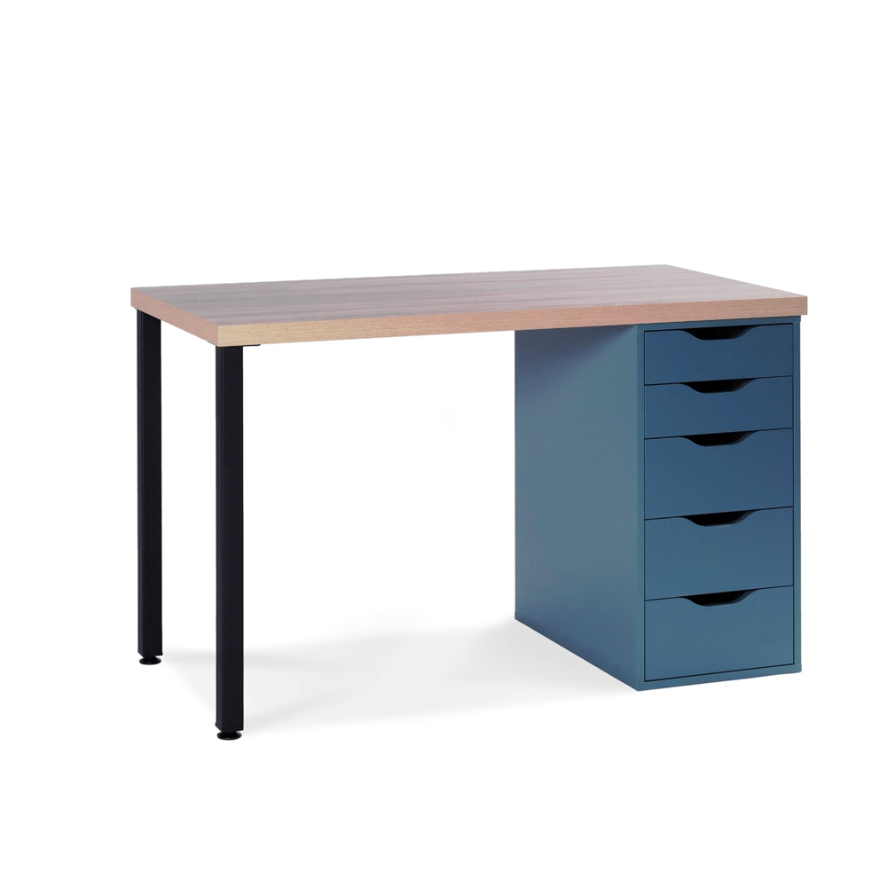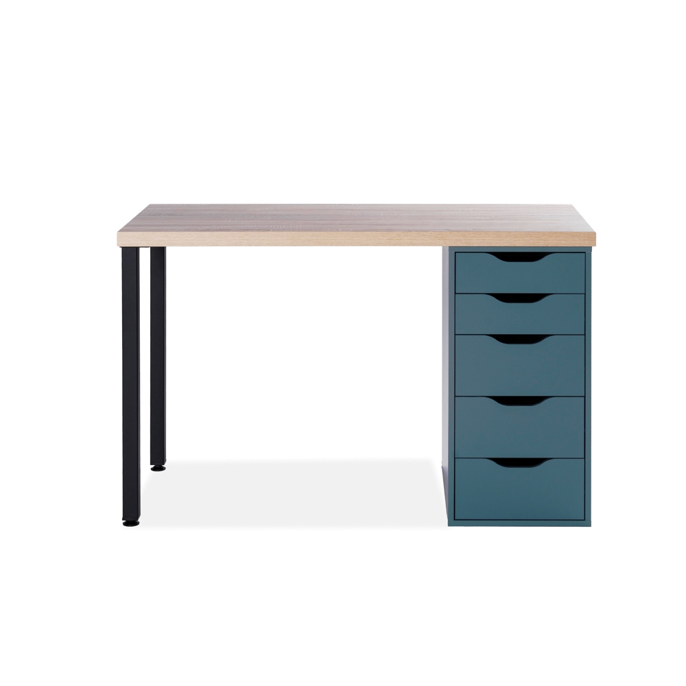 Стол письменный Ингар 1/5Т, 120x75x55, цвет Дуб бёлёный/серо-бирюзовый/чёрный. Стол комплектуется столешницей, двумя металлическими ножками и тумбой под столешницу с пятью выдвижными ящиками. Конструкция столешницы - тамбурат (рамка из ДСП и HDF с сотовым заполнением) - популярная современная технология, активно внедряемая крупнейшими производителями для изготовления мебели по скандинавским стандартам. Ножки - крашенный металл в чёрный цвет. Опоры ножек регулируемые. Конструкция тумб стола: ДСП, поверхность, декорированная бумага, окраска УФ материалами. Фасады ящиков без ручек, с вырезами для удобного выдвижения. Ящики переменной высоты позволяют использовать их для хранения разнообразных предметов.Преимущества: облегченная конструкция (тамбурат); высокая прочность, устойчивость; простая, быстрая сборка; эстетичный внешний вид. Гарантийный срок для жилых и общественных помещений 24 месяца.