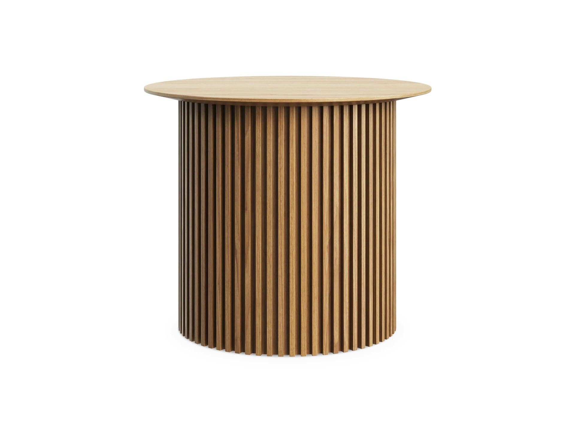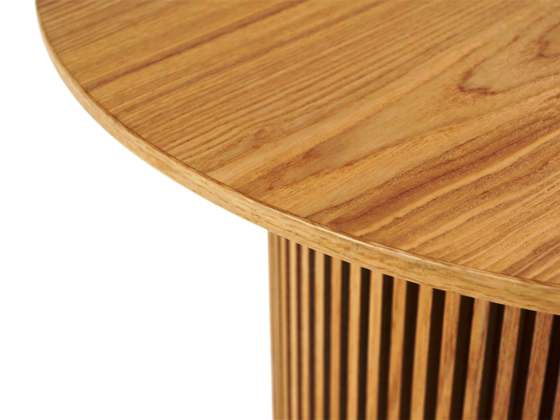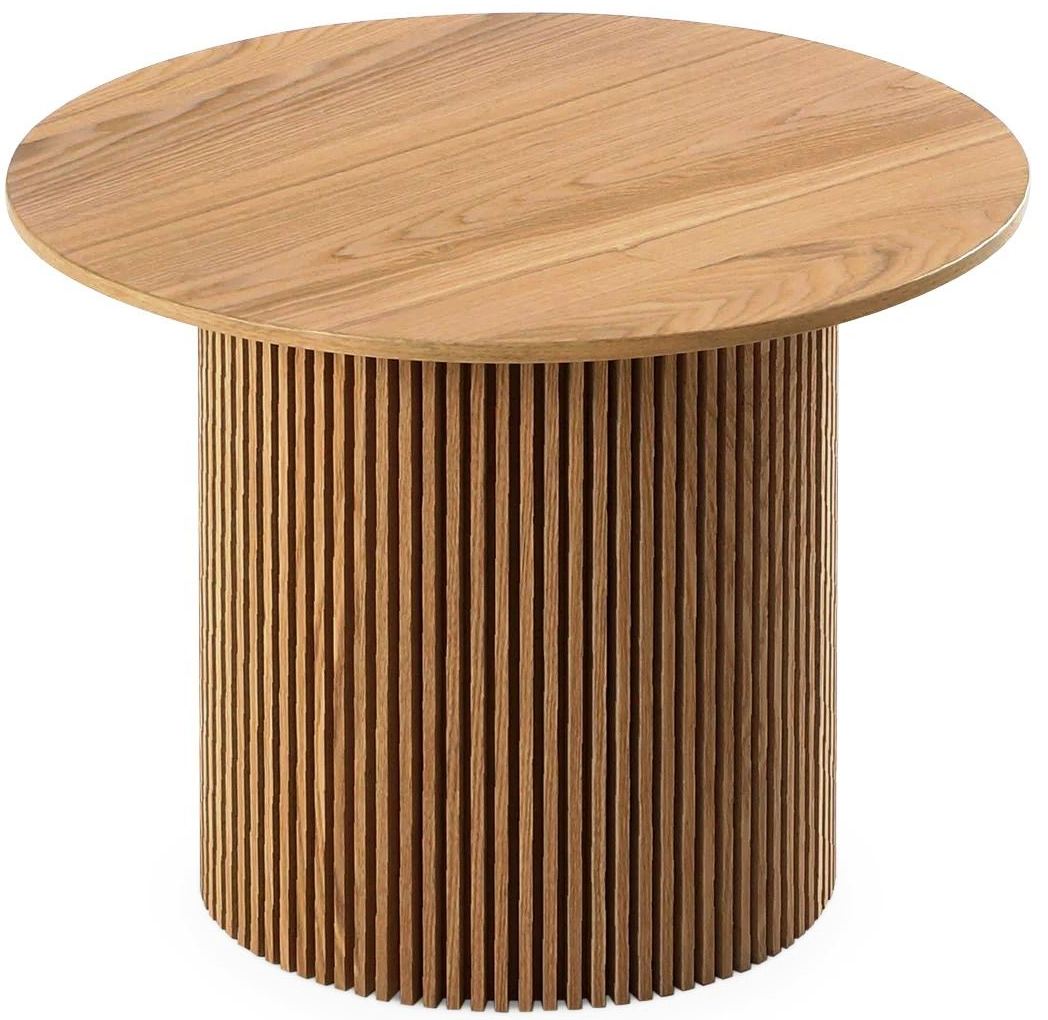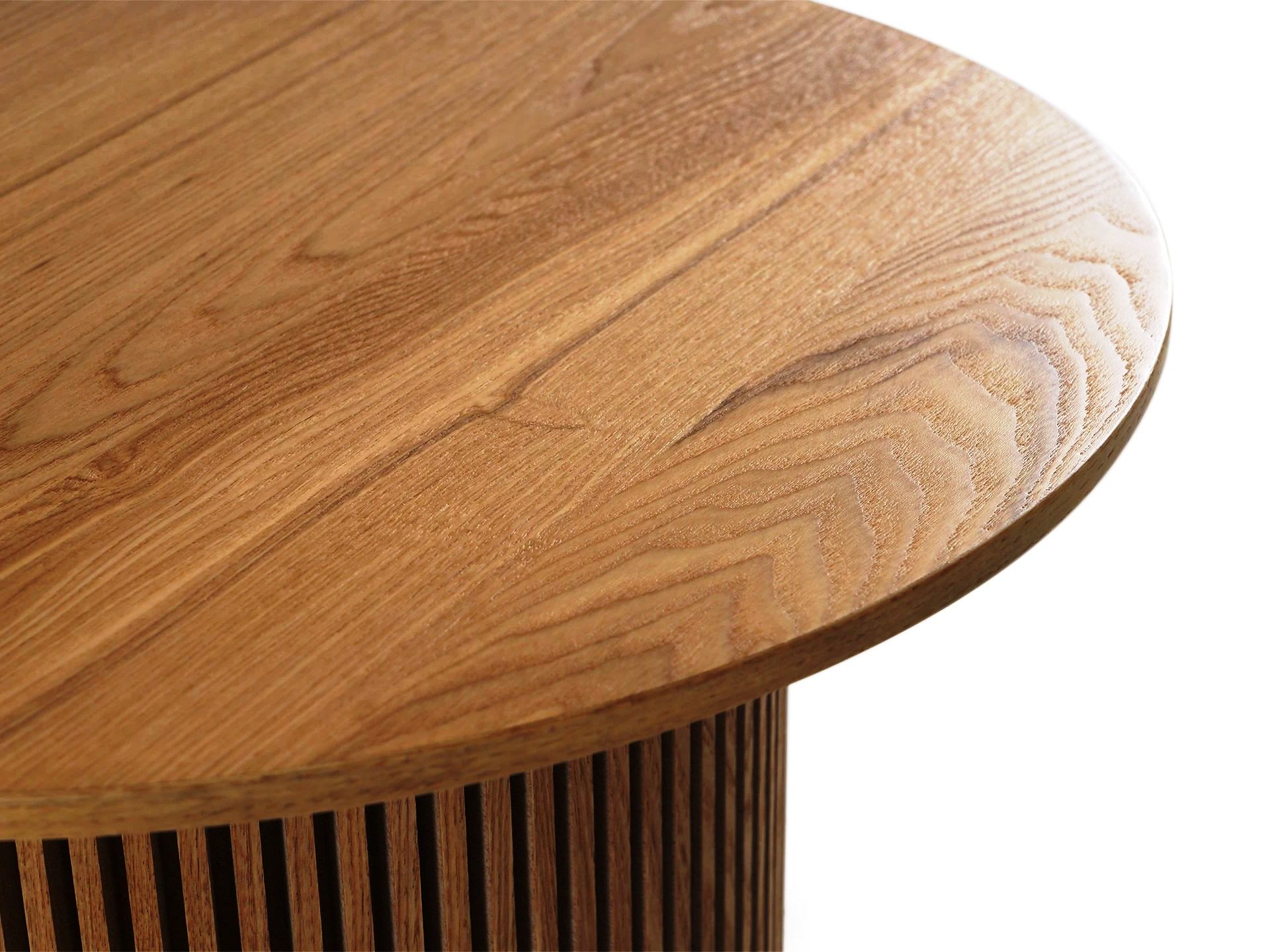 Дизайн сфокусирован на контрастном взаимодействие фактур. Цилиндрическое основание с «гофрированной поверхностью» поддерживает гладкую круглую столешницу. Рельефные углубления на ножке придают динамичности, выразительности, эффектности. С этим столиком можно создавать вариативные интерьерные комбинации, которые подчеркнут индивидуальный характер пространства. Красивый естественный рисунок внесёт в пространство частичку природной энергии. Уместен будет в любой локации от диванной зоны до спальни.