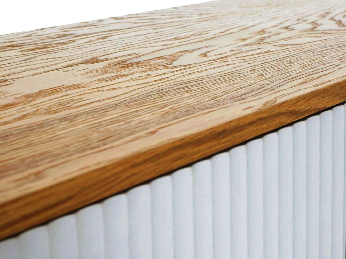Фасад и боковые стенки коллекции Mikko с фрезеровкой выполнены из МДФ толщиной 18 мм. в четырех вариантах декоров: Софт Сантьяго, Шарли Терракота, Шарли Грин, Графит. Крышка из МДФ толщиной 16 мм., облицованной строганным шпоном дуба. Остальные детали корпусов выполнены из плиты ламинированной толщиной 16 мм., декор белый гладкий.