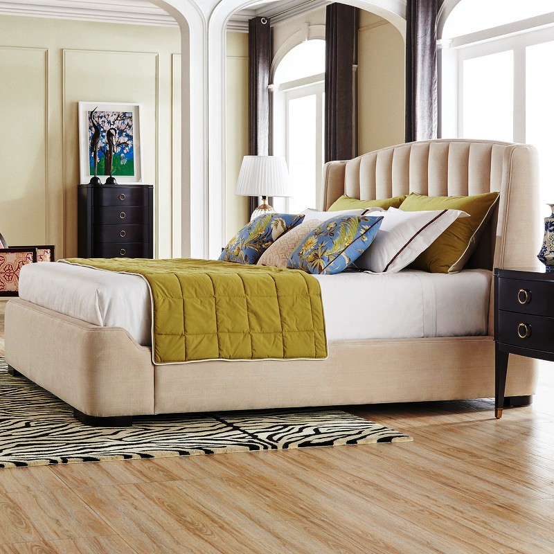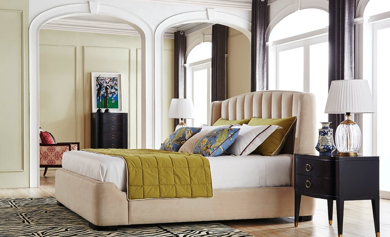 Роскошная двуспальная кровать Modena от итальянского бренда Fratelli Barri в неоклассическом стиле. Изголовье с загнутыми боковинками («ушами»). База модели красиво оформлена текстилем и имеет красивый изгиб во фронтальной зоне.