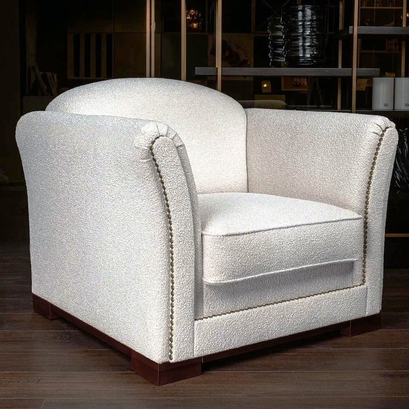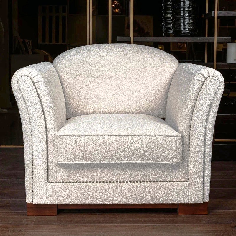 Обивка - ткань букле в светло-бежевых, почти белых тонах. Ножки из массива дерева, тонированы под орех.