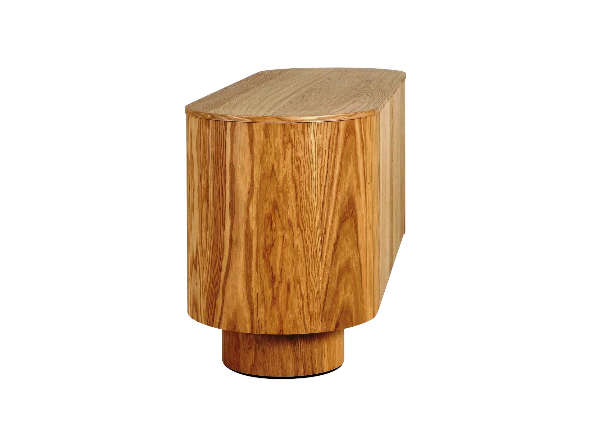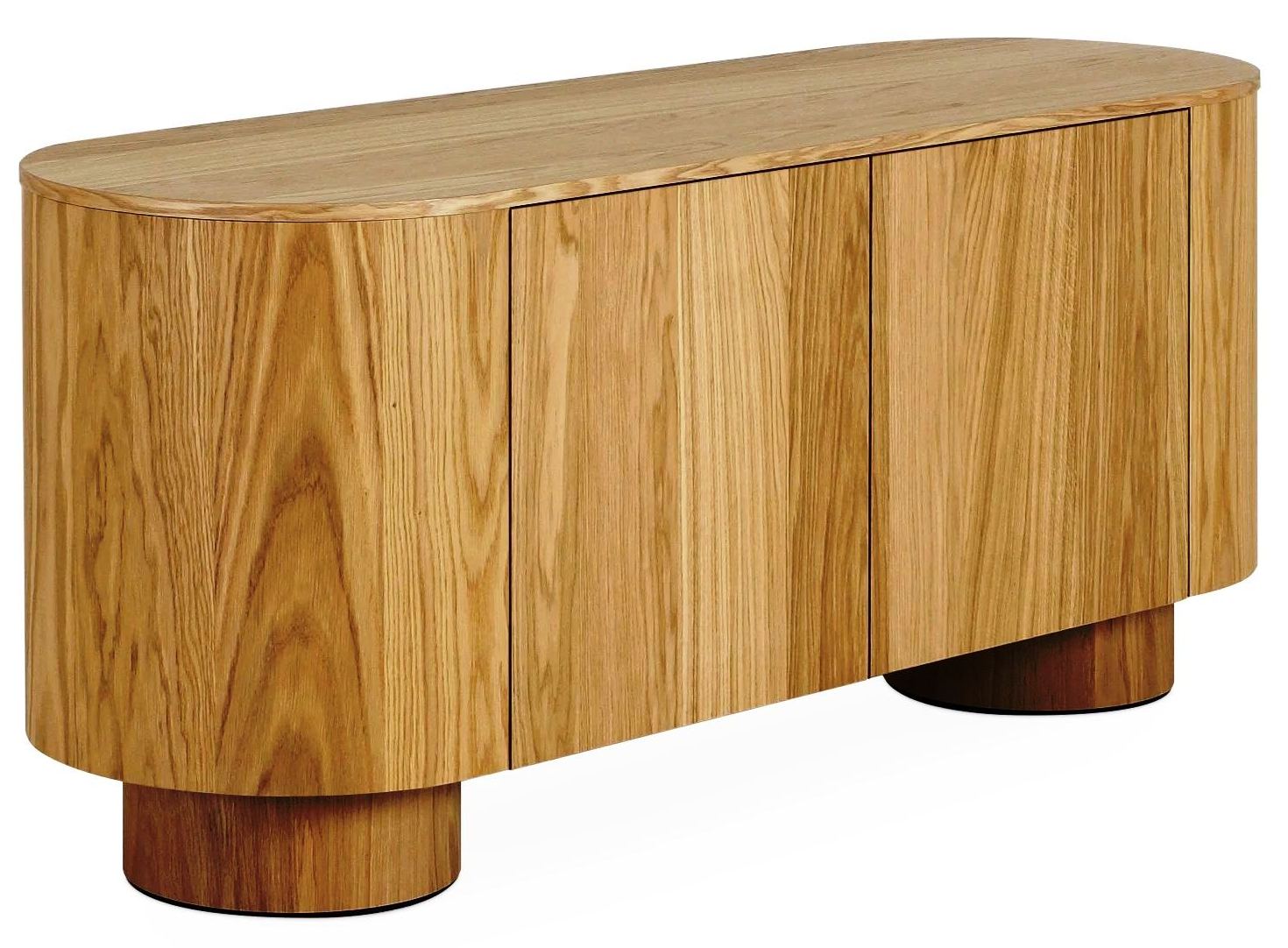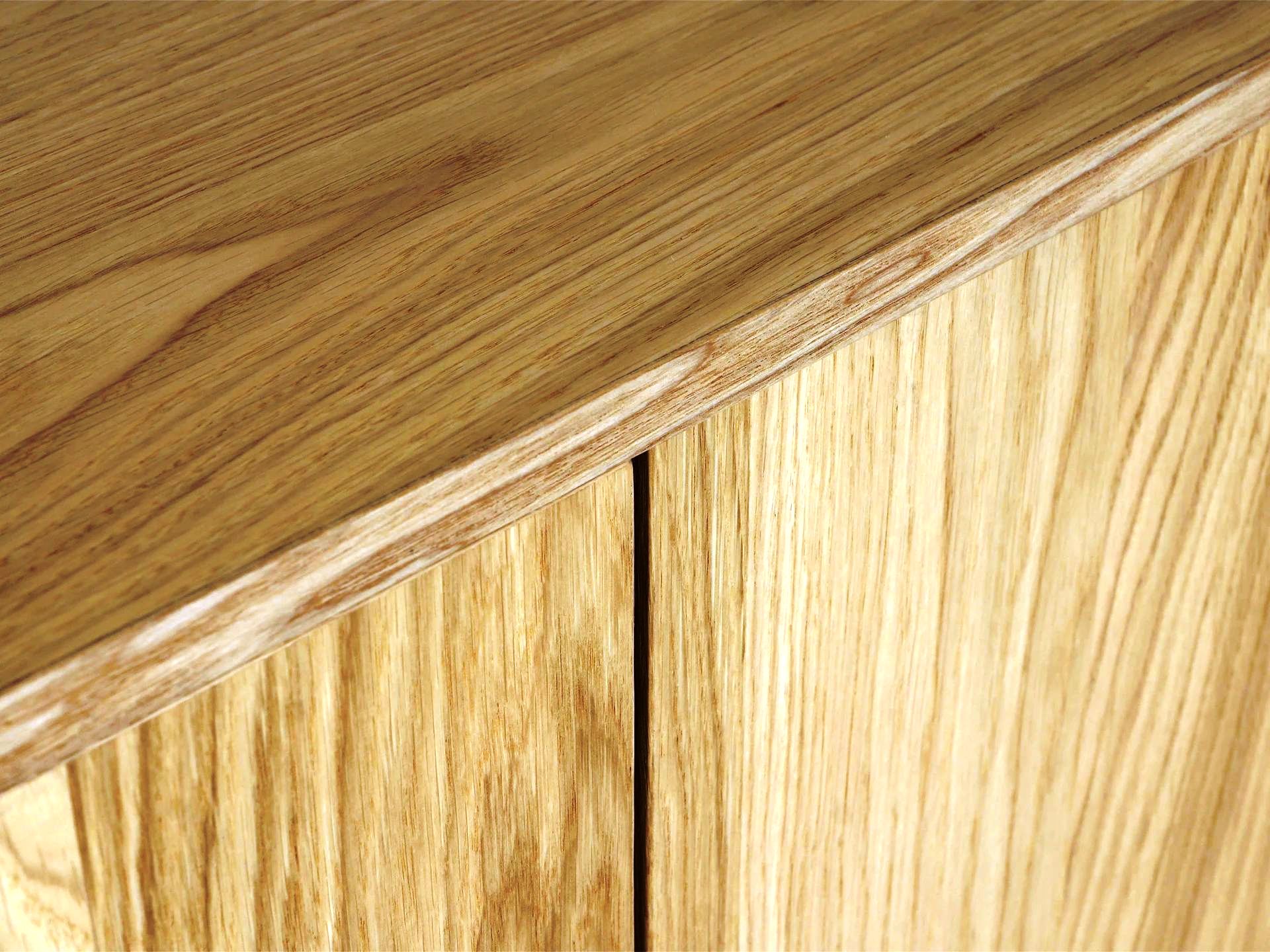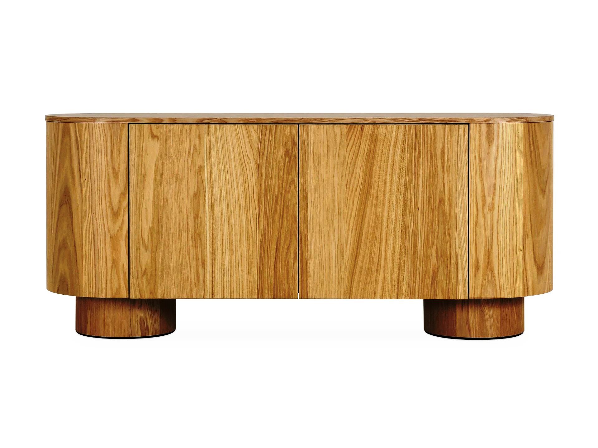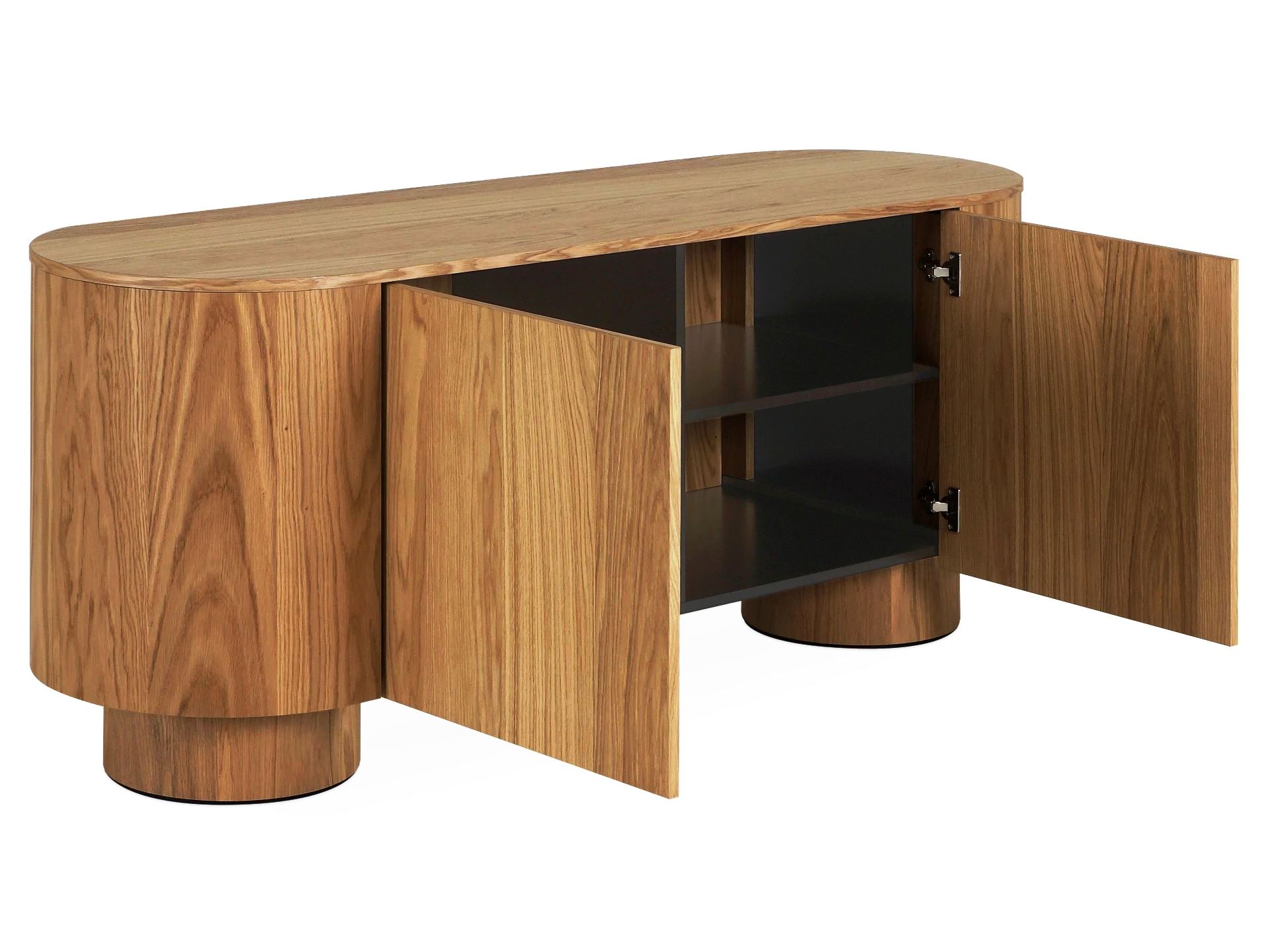 Сервант Kota сочетает в себе художественную эстетику с повседневной практичностью. Его дизайн вдохновлён самой природой с дыханием лесов и просторов полей. На двух широких круглых ножках крепко стоит основательный корпус с плавными линями. Внимание привлекает не только выразительная геометрия, но и отделка поверхности натуральным дубовым шпоном. Тёмные прожилки древесных волокон на светлом фоне сливаются в причудливые узоры, подчеркивая уникальность каждого изделия.