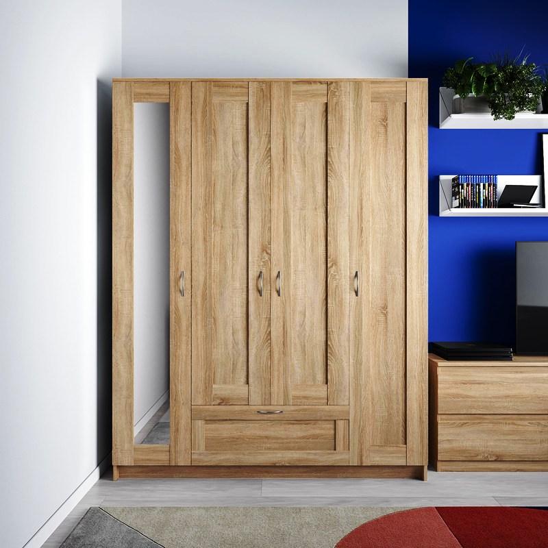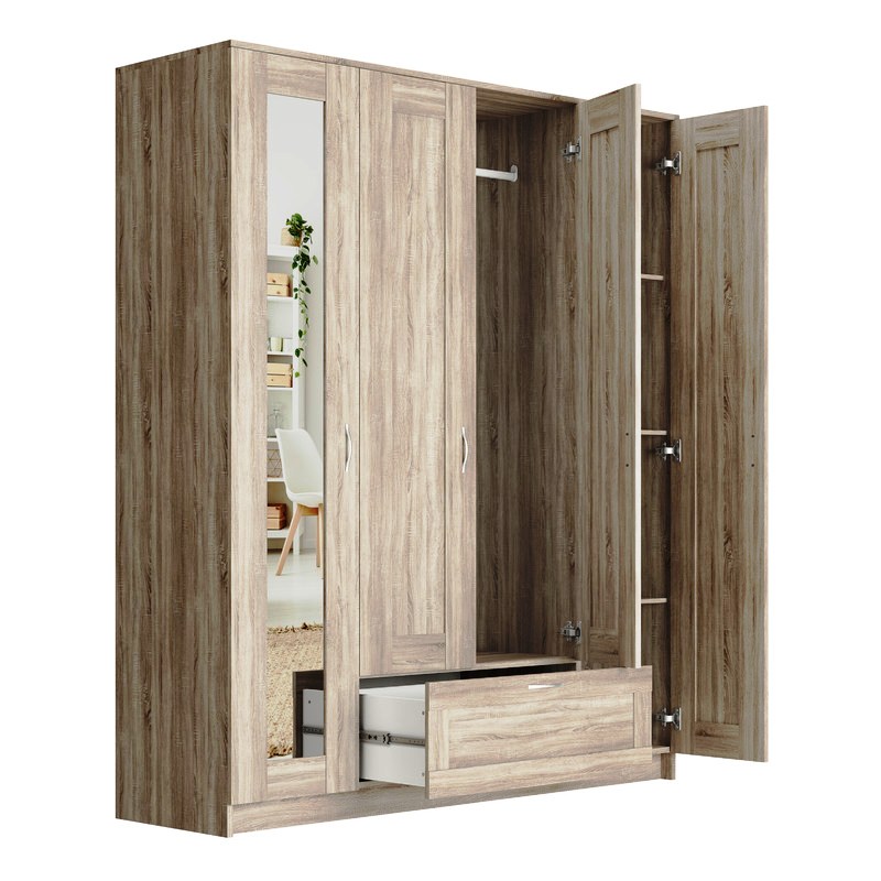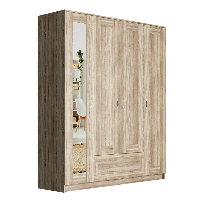 Шкаф СИРИУС комбинированный для одежды четырехдверный, с выдвижным ящиком и одним зеркалом, 1561х502х1900, цвет Дуб Сонома. Изготовлен из кашированного ДСП толщиной 16 мм. Крепится к стене. Гарантийный срок для жилых помещений 24 месяца, для общественных помещений - 18 месяцев.