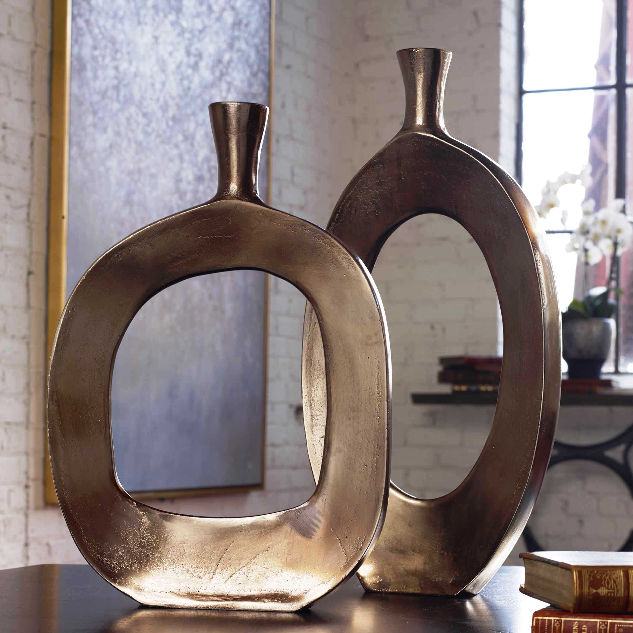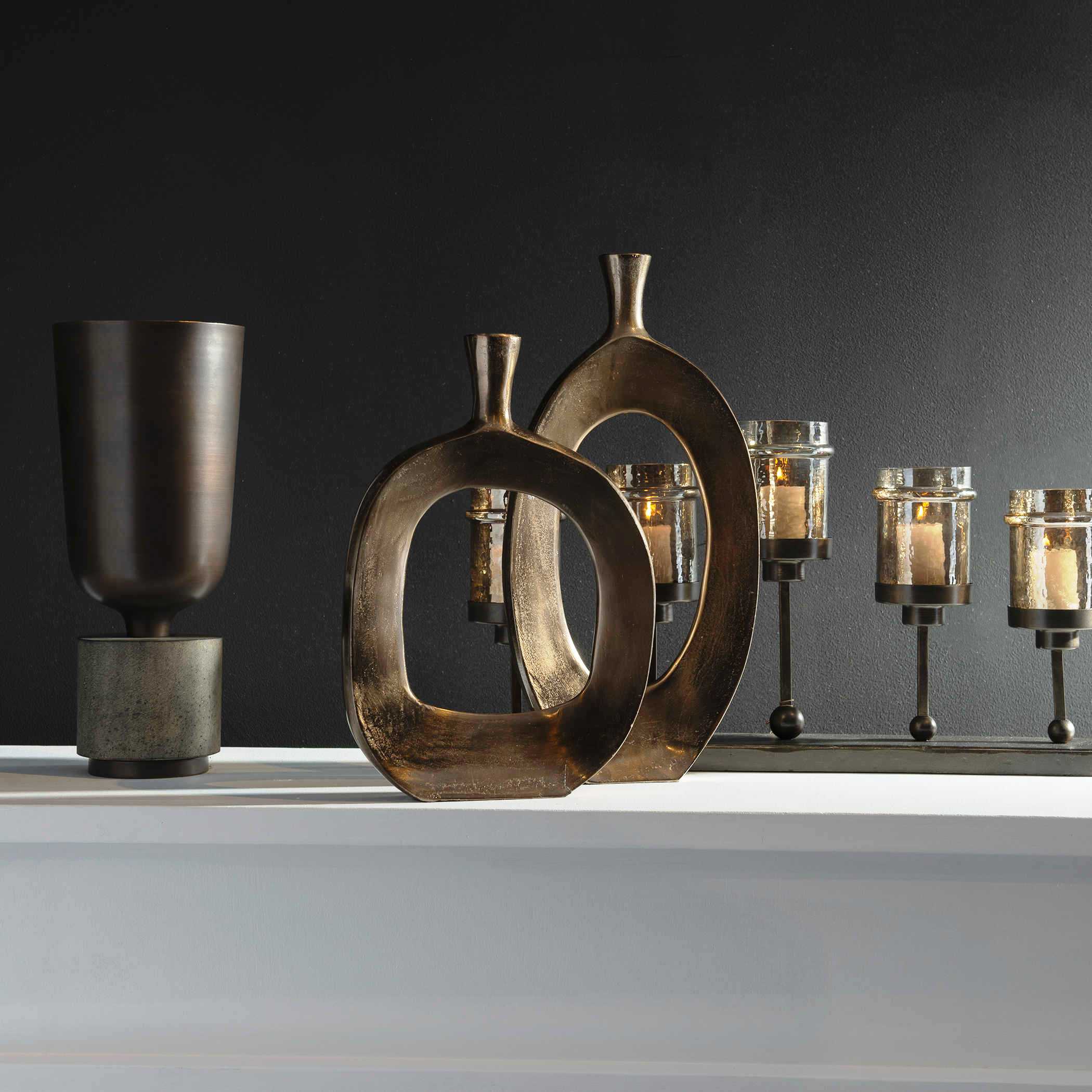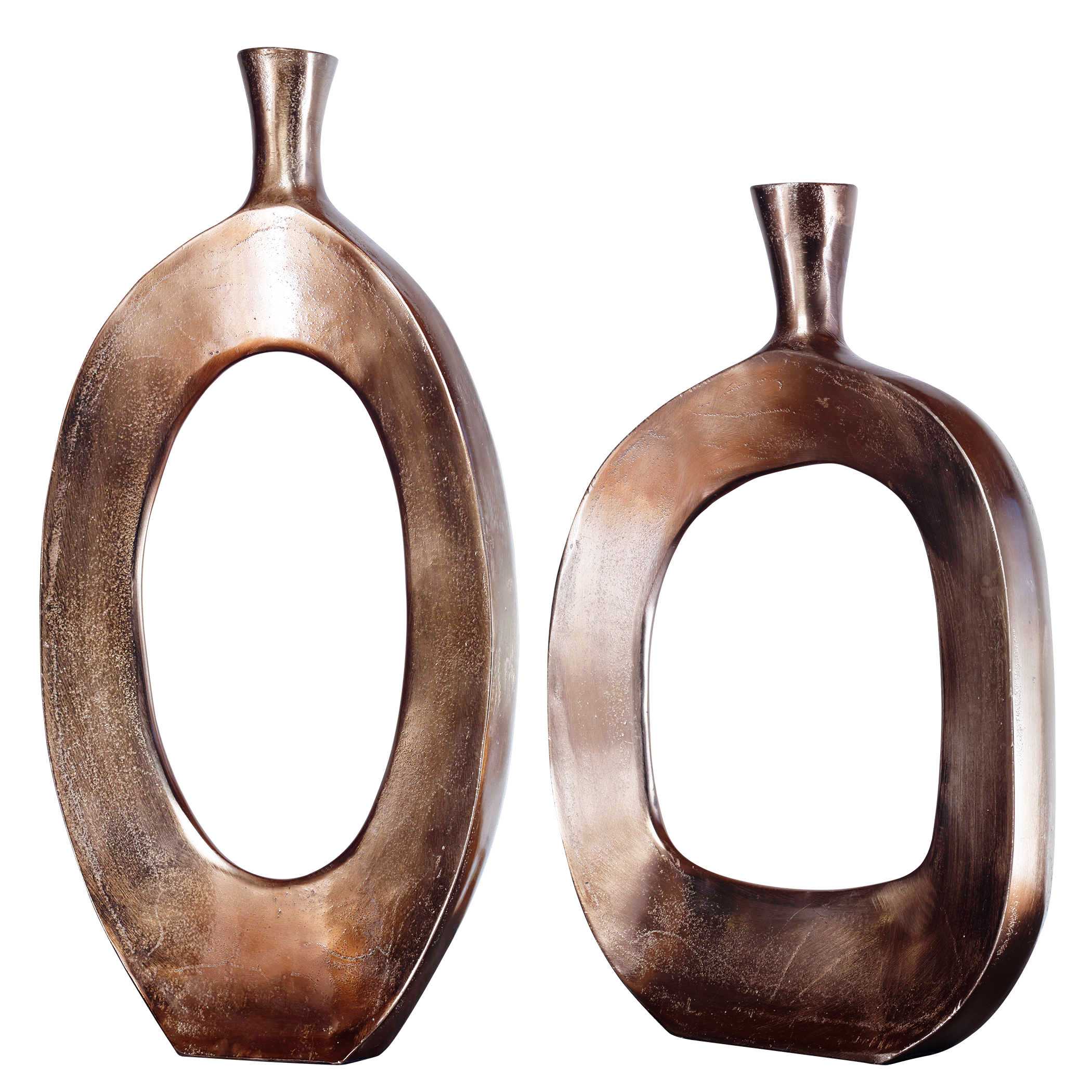 Комплект из двух ваз ручной работы. Вазы изготовлены литого алюминия и покрыты бронзой. Интересная манера исполнения придает вазам особый стиль и некий шик. Размеры ваз: S-13x18x2, L-11x22x2. Прекрасно подойдут в качестве подарка.