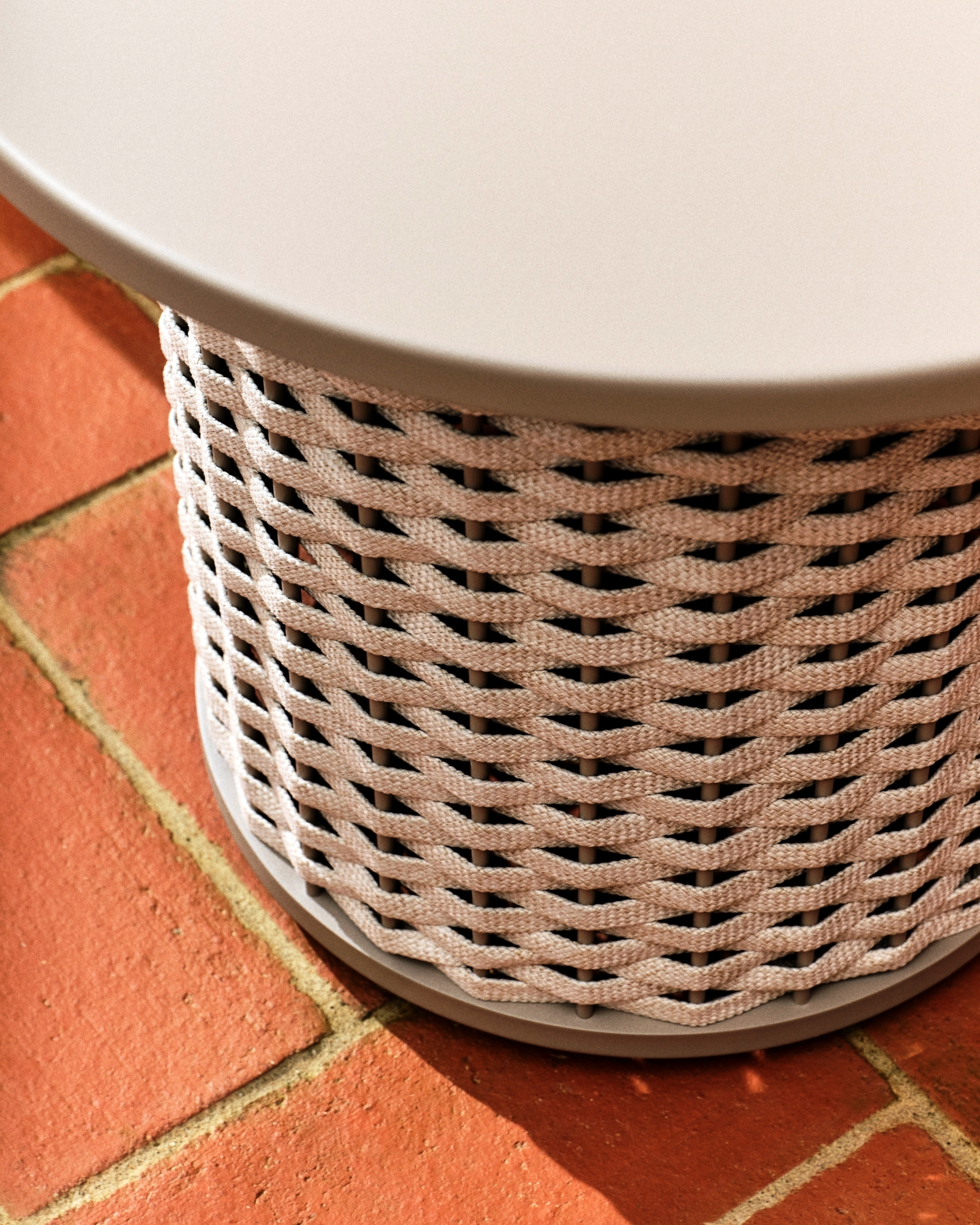 Столик представляет собой цельную стальную конструкцию (алюминий), которая вручную декорирована синтетическим шнуром. Столешница круглая, толщиной 2 см и диаметром 50 см.