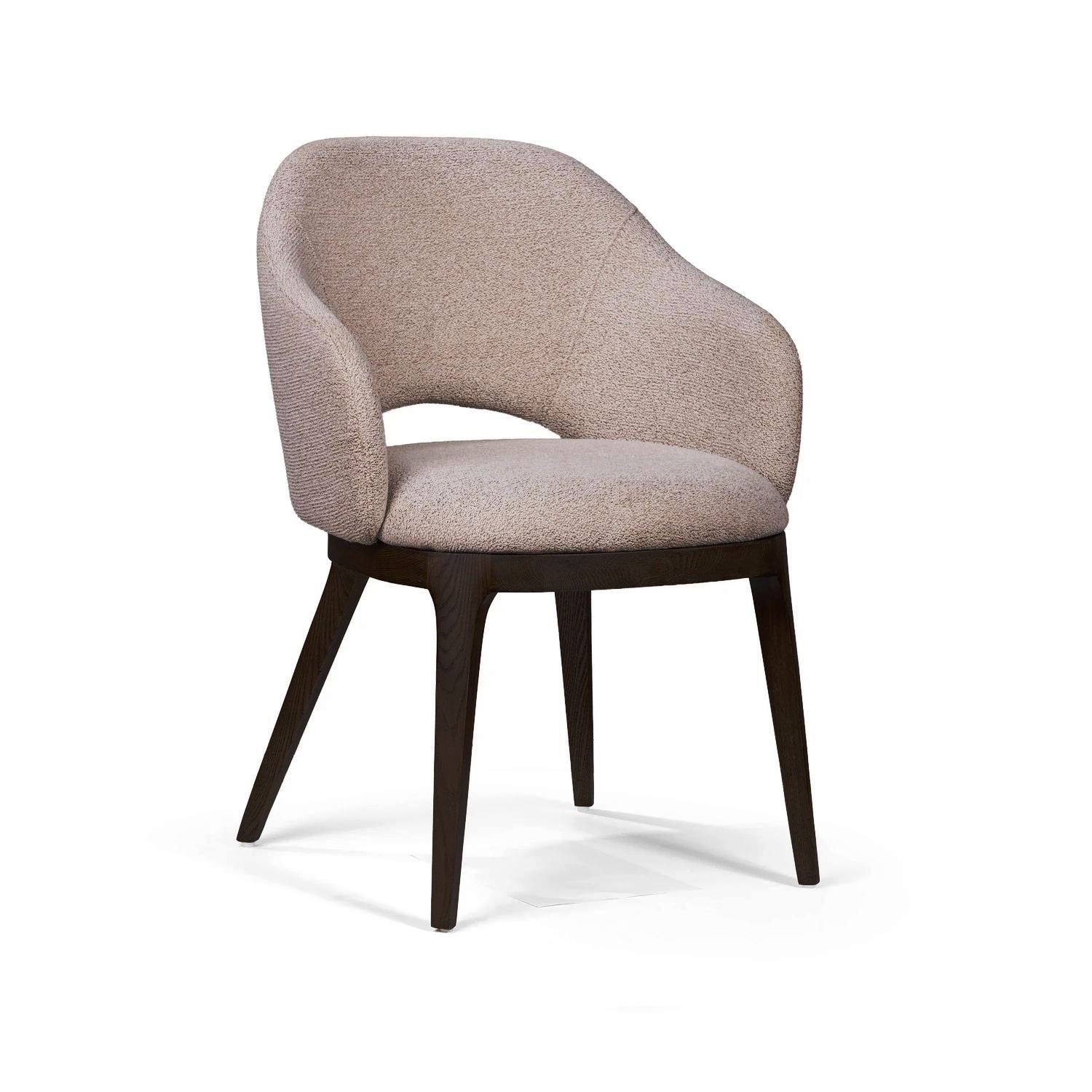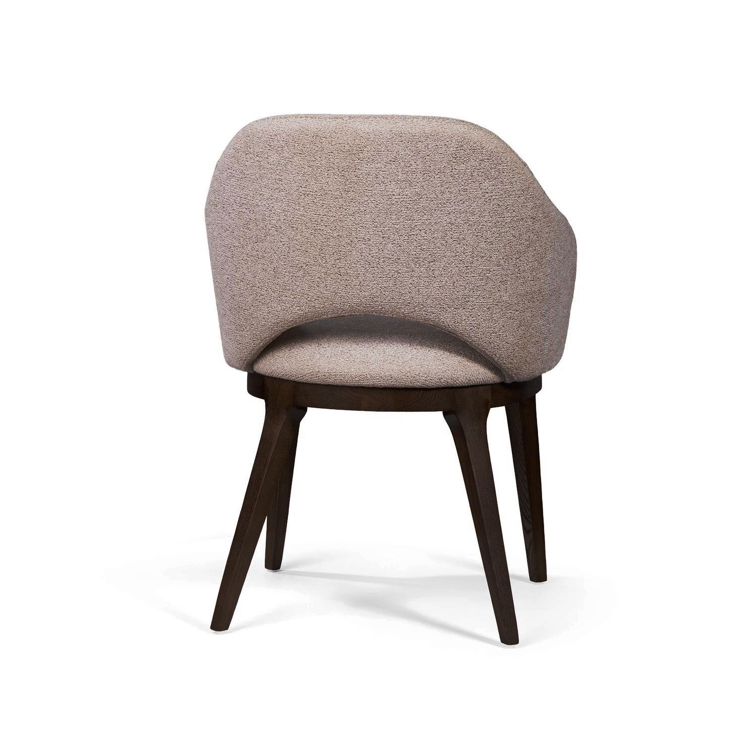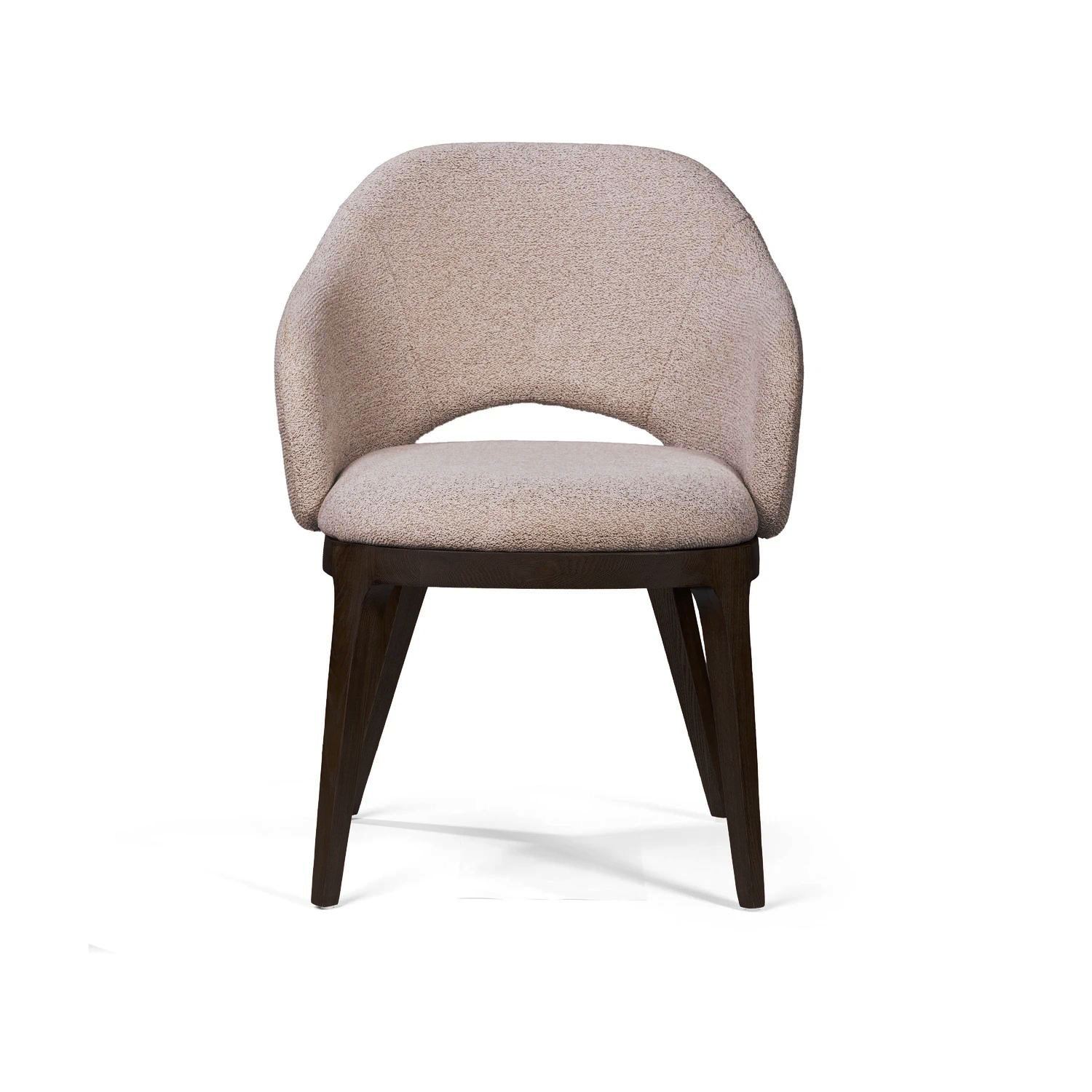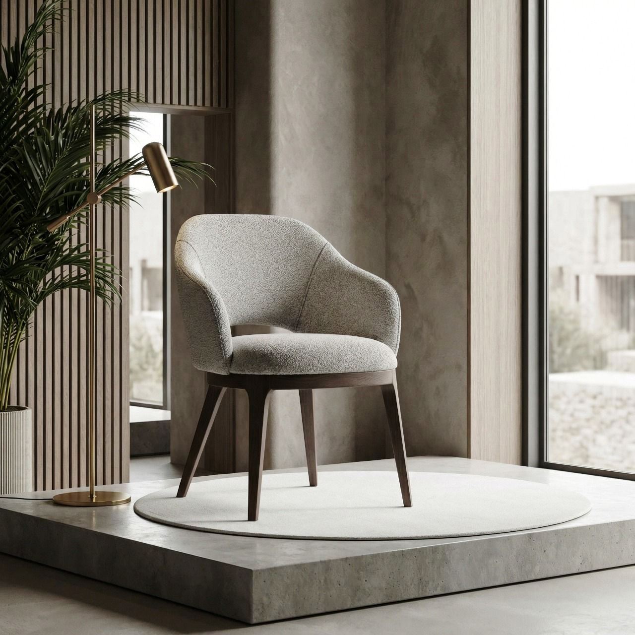 Сиденье и спинка выполнены в буклированной ткани с мягким, приятным ворсом. Такая фактура создает ощущение уюта и визуальной глубины, делая мебель особенно актуальной для современных интерьеров. Материал отличается хорошей износостойкостью и подходит как для домашнего использования, так и для коммерческих пространств.