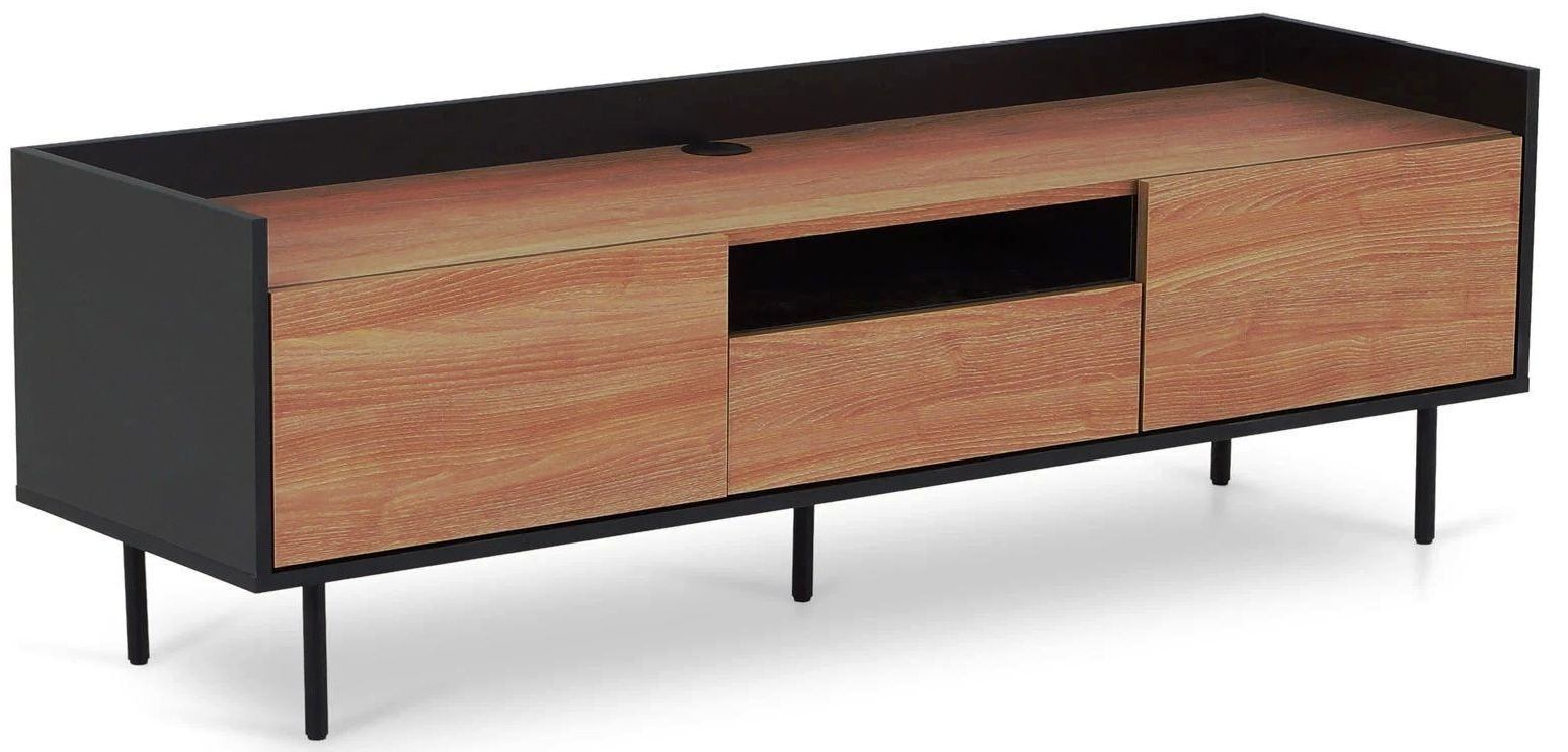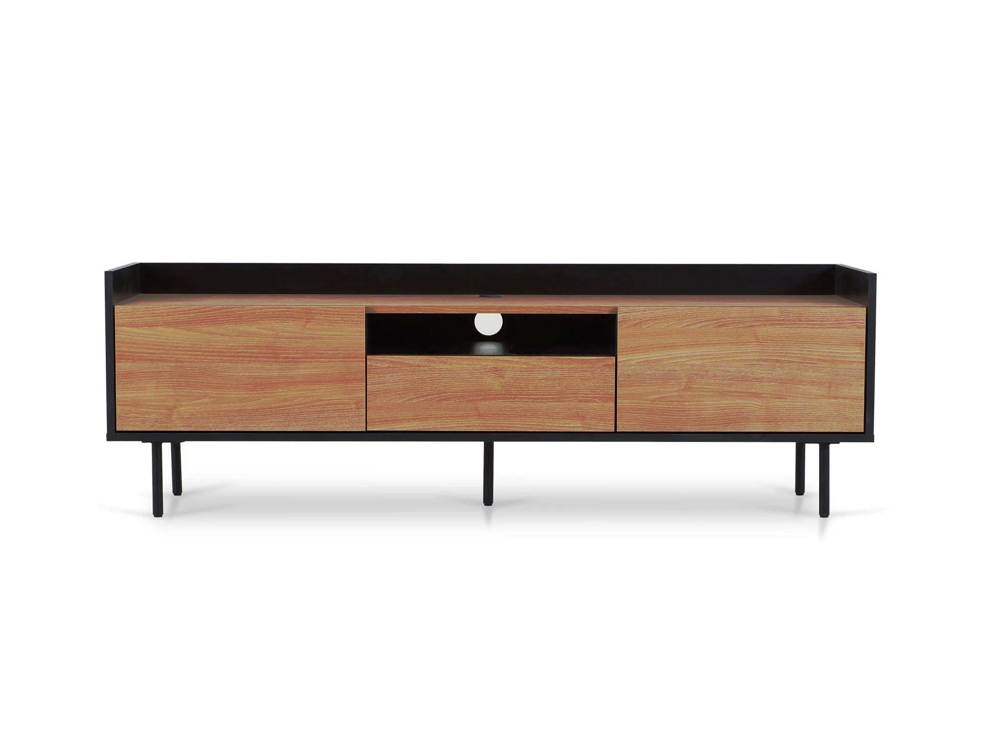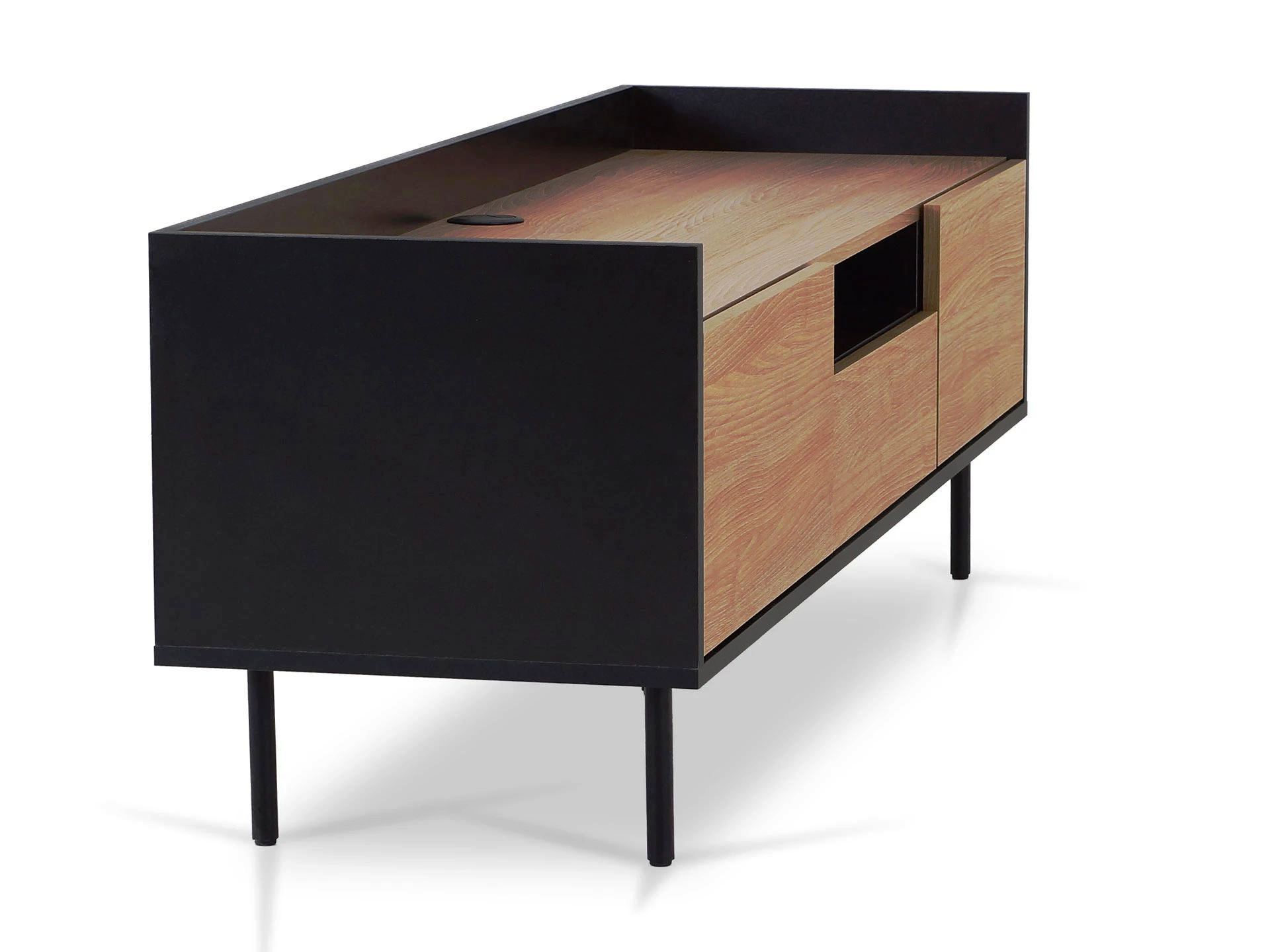 Особенность линейки заключается в контрасте элементов. Скругленные изящные металлические ножки поддерживают внушительное основание. При этом внешний вид моделей остается лёгким и элегантным. Также игру противоположностей усиливают древесная текстура на фасадах и чёрный цвет боковин с задней стенкой. Что придаёт большей динамики и выразительности дизайну. Эксклюзивность и завершенный вид воссоздает рамка, возвышающаяся над верхним горизонтом. Минималистичный вид конструкциям обеспечивает скрытая фурнитура.