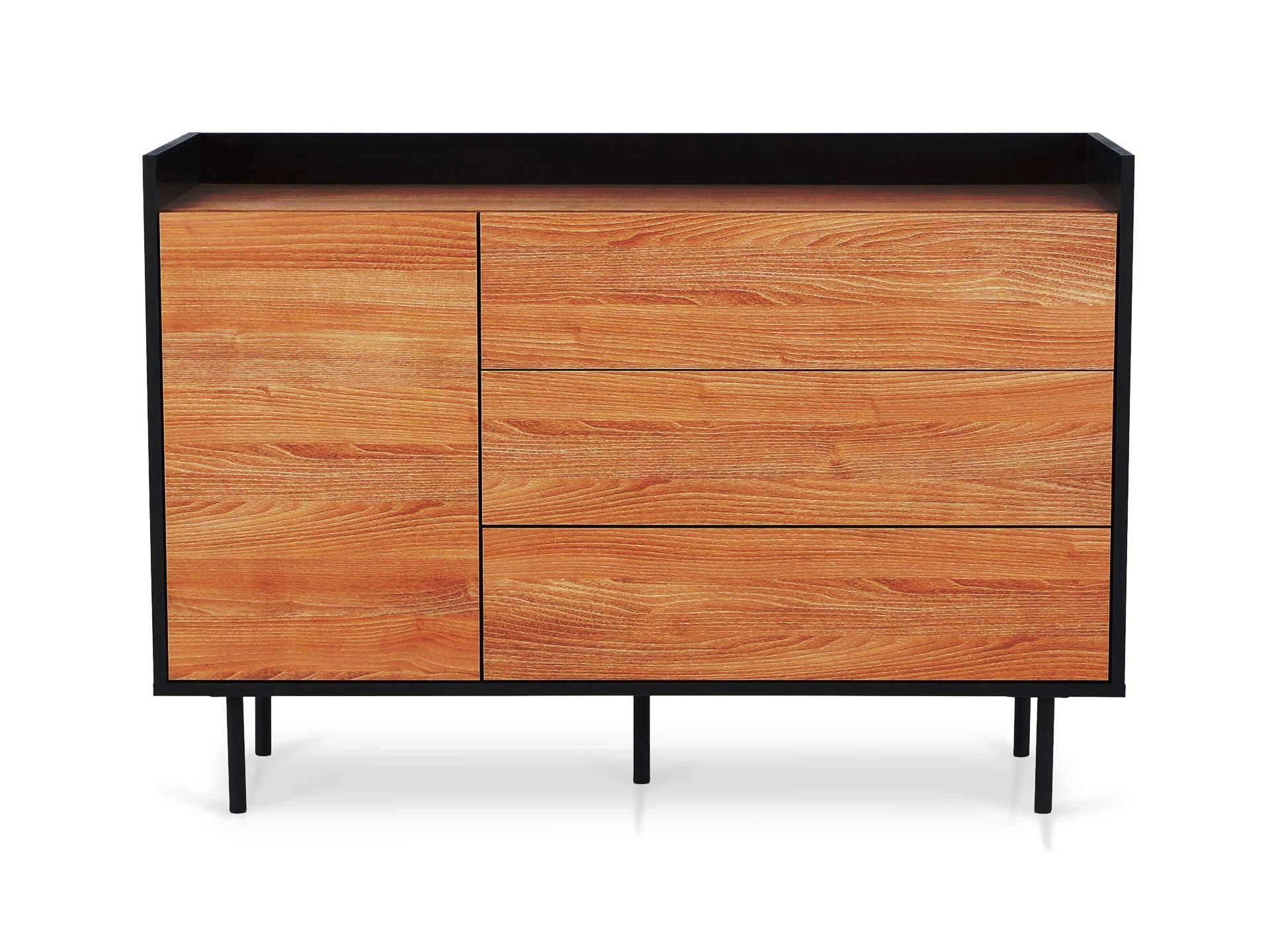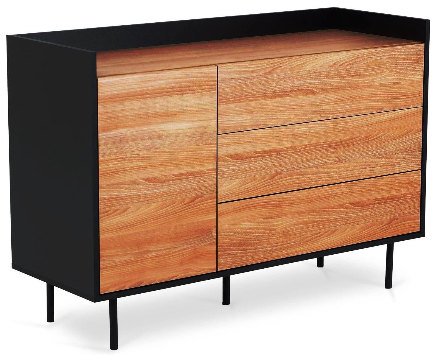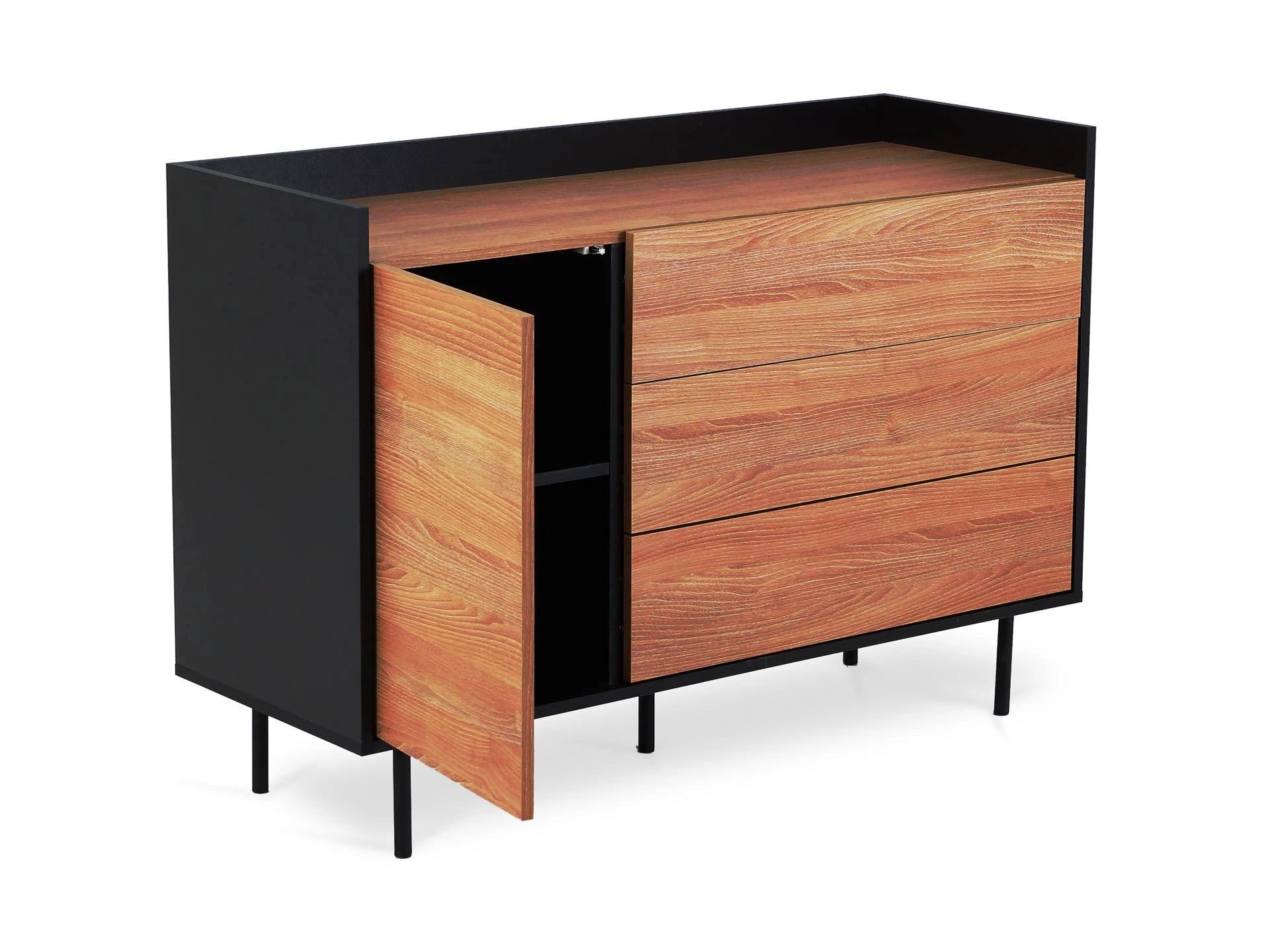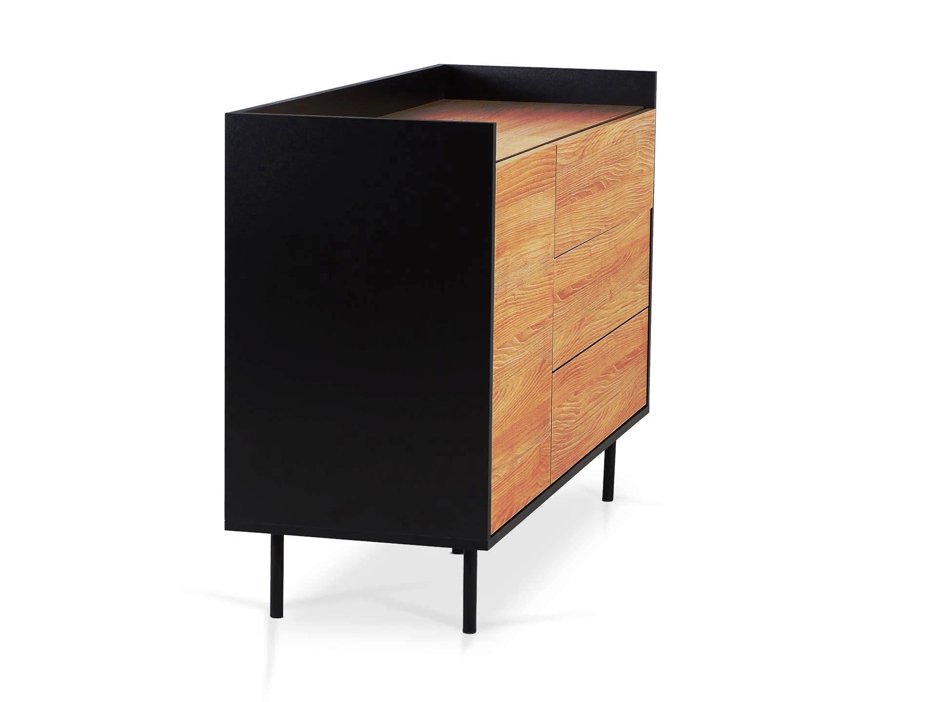 Особенность линейки заключается в контрасте элементов. Скругленные изящные металлические ножки поддерживают внушительное основание. При этом внешний вид моделей остается лёгким и элегантным. Также игру противоположностей усиливают древесная текстура на фасадах и чёрный цвет боковин с задней стенкой. Что придаёт большей динамики и выразительности дизайну. Эксклюзивность и завершенный вид воссоздает рамка, возвышающаяся над верхним горизонтом. Минималистичный вид конструкциям обеспечивает скрытая фурнитура. Двери и ящики открываются плавно, без шума и усилий. Комбинируйте комоды и серванты Look для создания целостного образа интерьера.